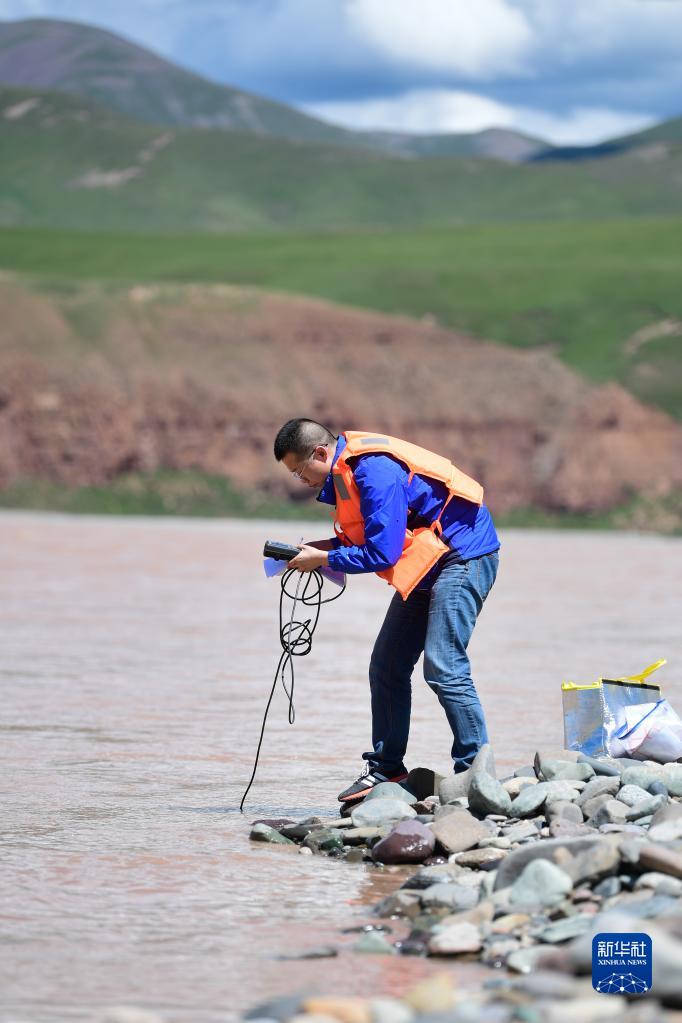 長(cháng)江科學(xué)院流域水環(huán)境研究所副所長(cháng)趙良元在長(cháng)江上游通天河流域觀(guān)測水文(2021年7月24日攝)。 新華社記者 張龍 攝