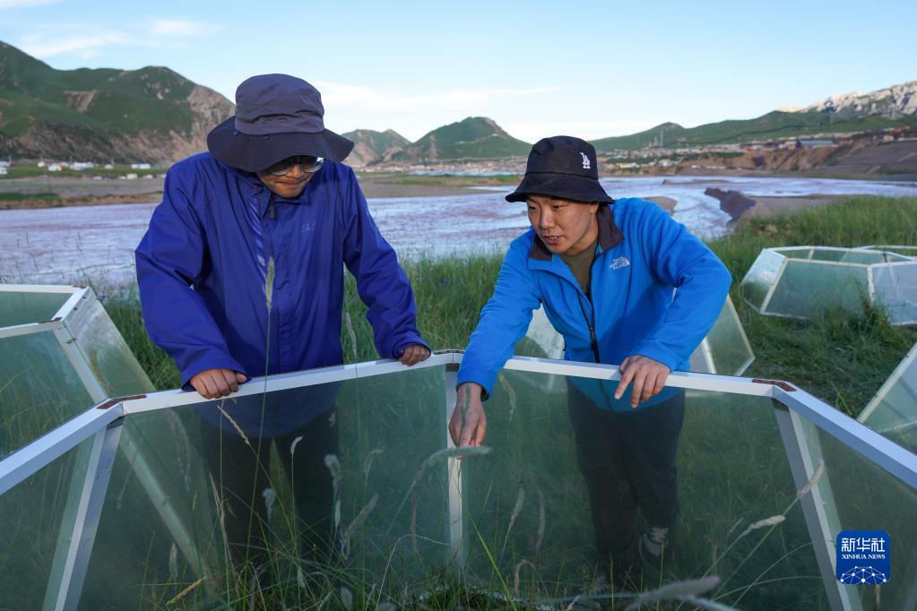 長(cháng)江科學(xué)院博士任斐鵬(右)和孫寶洋在江源布設六邊形溫箱開(kāi)展“模擬增溫試驗”(2021年7月22日攝)。 新華社記者 張龍 攝