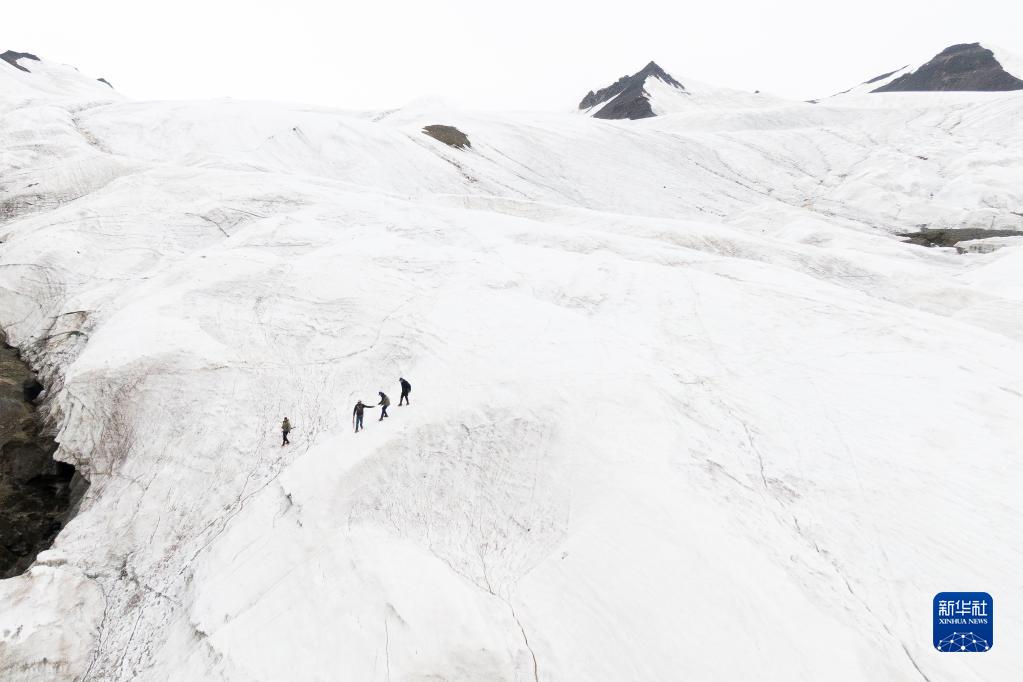來(lái)自長(cháng)江科學(xué)院的科考隊員在各拉丹冬雪山上(2022年7月28日攝,無(wú)人機照片)。 新華社記者 肖藝九 攝