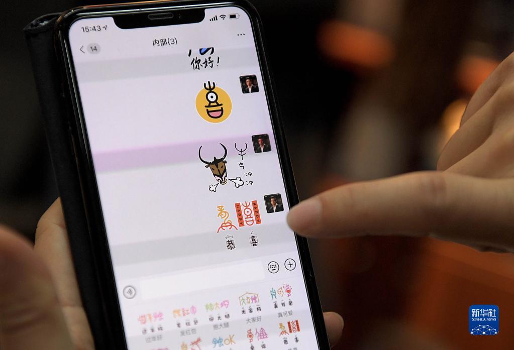 清華大學(xué)美術(shù)學(xué)院教授陳楠在位于清華大學(xué)的工作室內展示他設計發(fā)布的甲骨文表情包(2019年9月24日攝)。 新華社記者 李安 攝