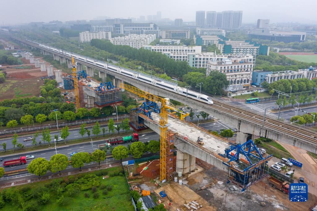 中鐵四局四公司的工程人員在江蘇南沿江城際鐵路站前Ⅰ標工程跨天元東路連續梁施工點(diǎn)施工作業(yè)(2021年4月27日攝,無(wú)人機照片)。新華社記者 李博 攝