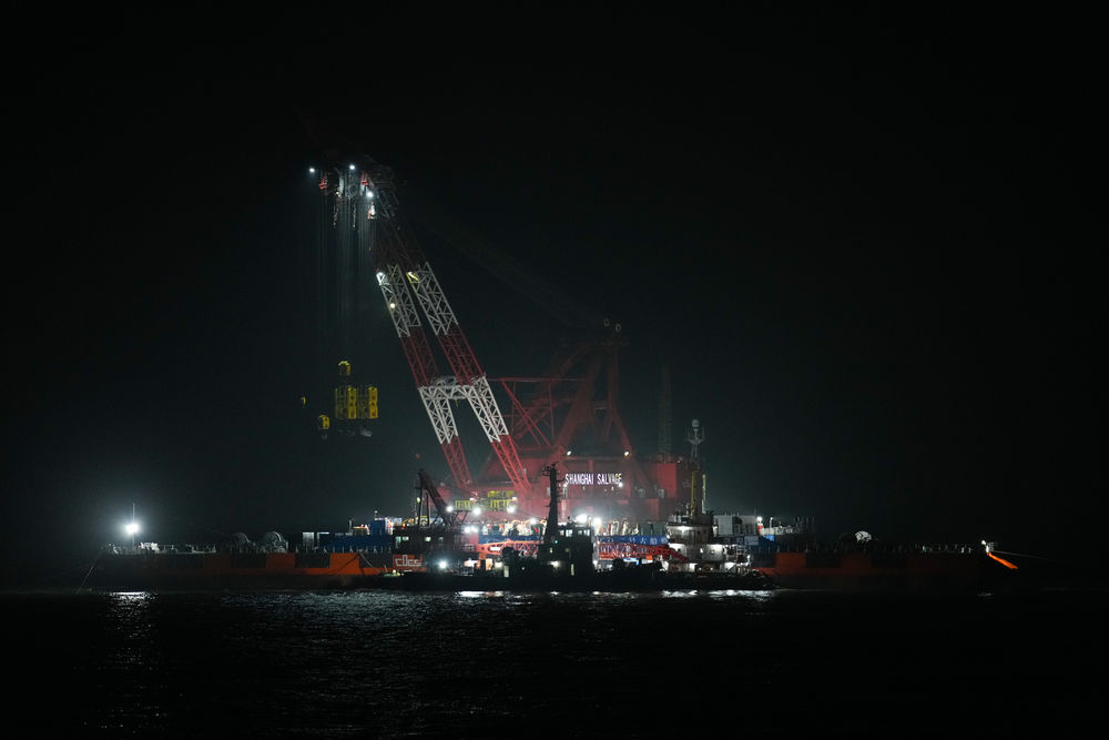 11月21日清晨,工作人員進(jìn)行長(cháng)江口二號古船打撈作業(yè)。