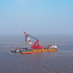 11月21日,工作人員下水給桅桿“穿上”保護衣。