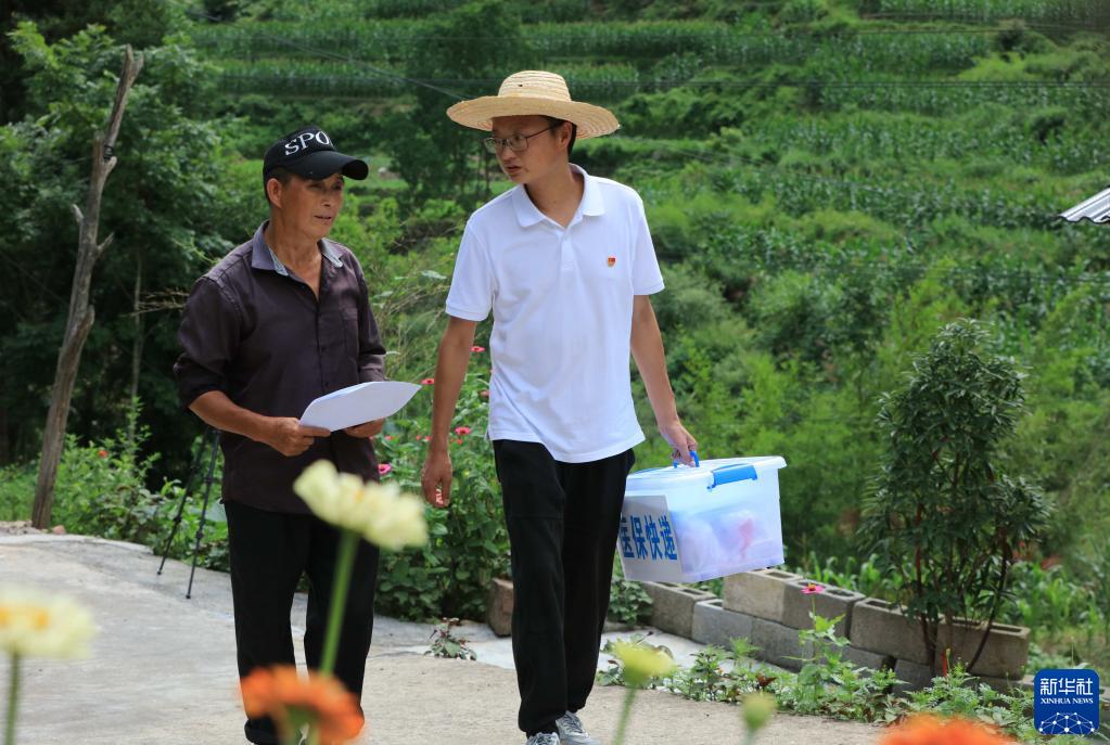 2022年7月5日,湖南省張家界市武陵源區天子山街道黃河村的“醫??爝f員”(右)在了解群眾訴求。新華社發(fā)(吳勇兵 攝)