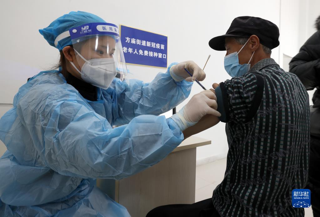 12月15日,在北京市海淀區中關(guān)村街道新冠疫苗接種點(diǎn),醫護人員為老年人接種新冠疫苗。新華社記者 任超 攝