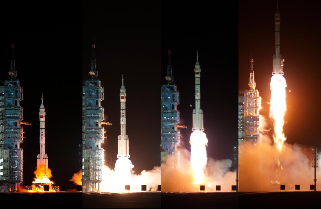 2022年11月29日,搭載神舟十五號載人飛船的長(cháng)征二號F遙十五運載火箭在酒泉衛星發(fā)射中心點(diǎn)火發(fā)射,約10分鐘后,神舟十五號載人飛船與火箭成功分離,進(jìn)入預定軌道,航天員乘組狀態(tài)良好,發(fā)射取得圓滿(mǎn)成功(拼版照片)。新華社記者 李剛 攝