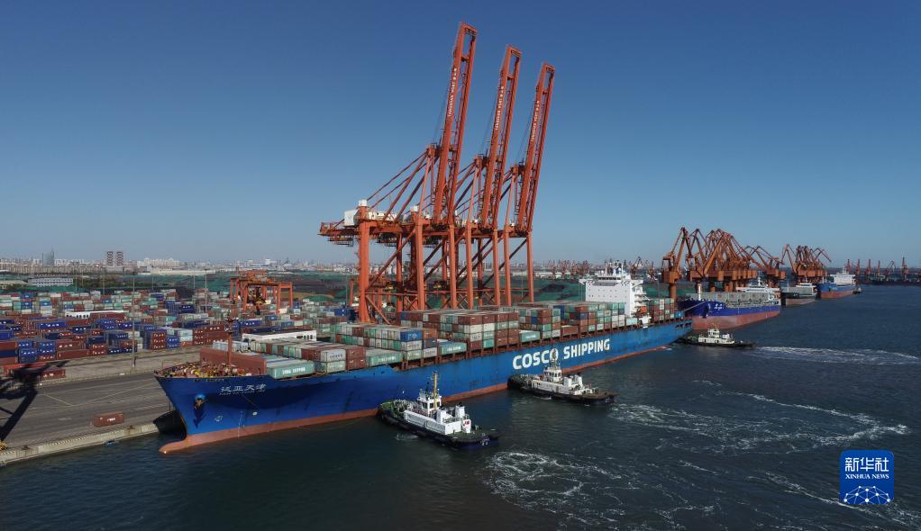 一艘輪船在拖輪的協(xié)助下向唐山港京唐港區集裝箱碼頭靠泊(2021年10月23日攝,無(wú)人機照片)。新華社記者 朱旭東 攝