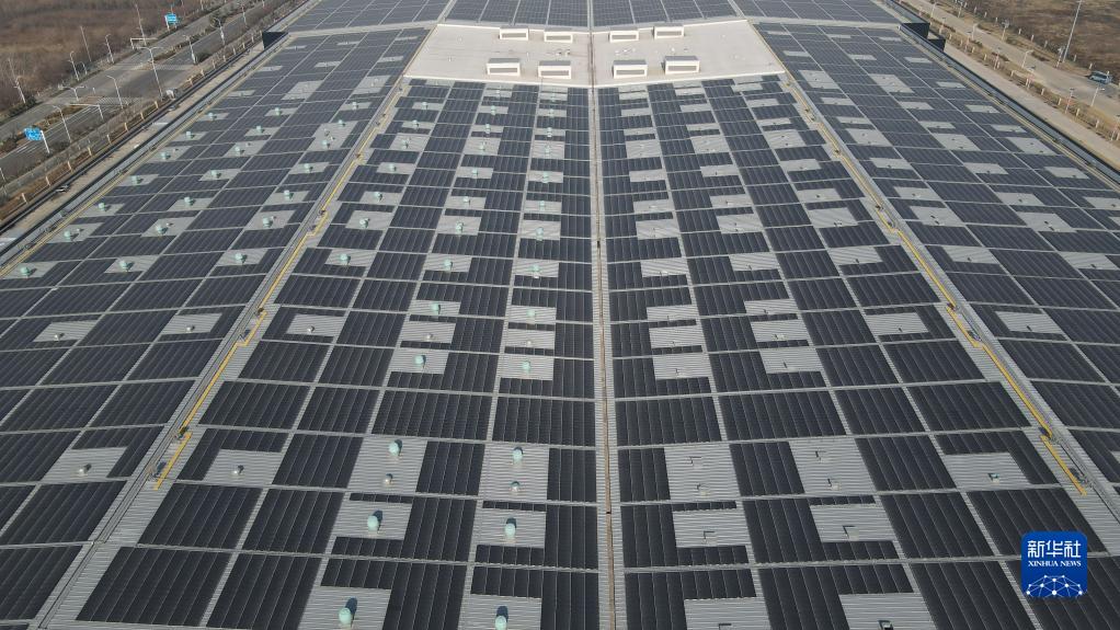 這是位于蚌埠中光電科技有限公司內的薄膜光伏建筑一體化應用示范項目(2021年12月21日攝,無(wú)人機照片)。新華社記者 張端 攝