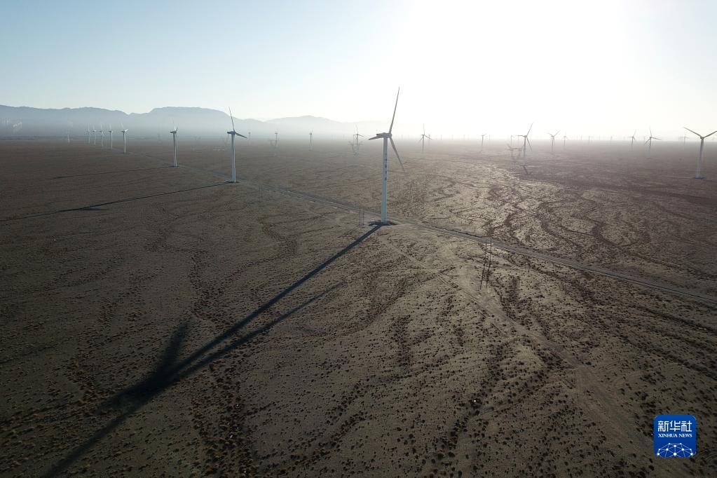 這是2021年12月8日拍攝的中節能(甘肅)風(fēng)力發(fā)電有限公司玉門(mén)昌馬風(fēng)電場(chǎng)的風(fēng)機(無(wú)人機照片)。新華社記者 范培珅 攝