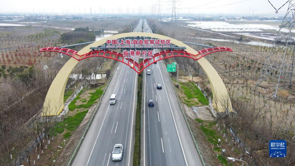 S2滬蘆高速上的中國(上海)自由貿易試驗區臨港新片區“海鷗門(mén)”(2月10日攝,無(wú)人機照片)。新華社記者 方喆 攝