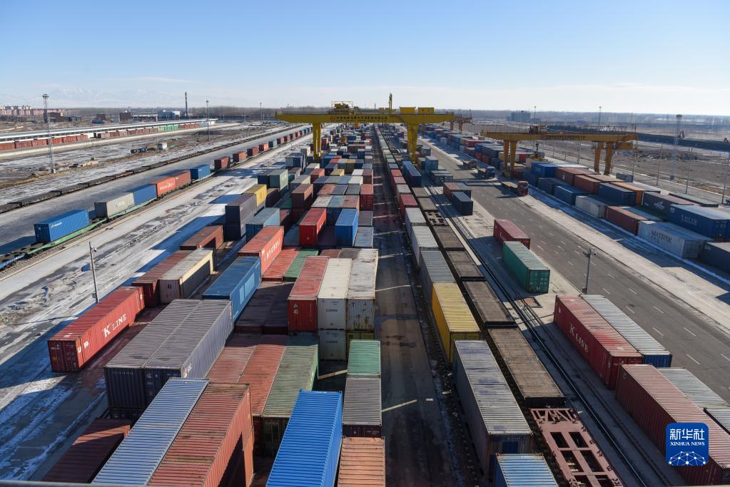 在新疆霍爾果斯鐵路口岸,換裝場(chǎng)內在進(jìn)行班列換裝作業(yè)(2021年2月6日攝)。新華社記者 丁磊 攝
