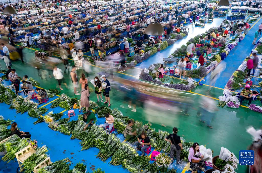 2022年7月12日,游客在夜間游覽云南昆明斗南花卉交易市場(chǎng)并選購鮮花。新華社記者 陳欣波 攝