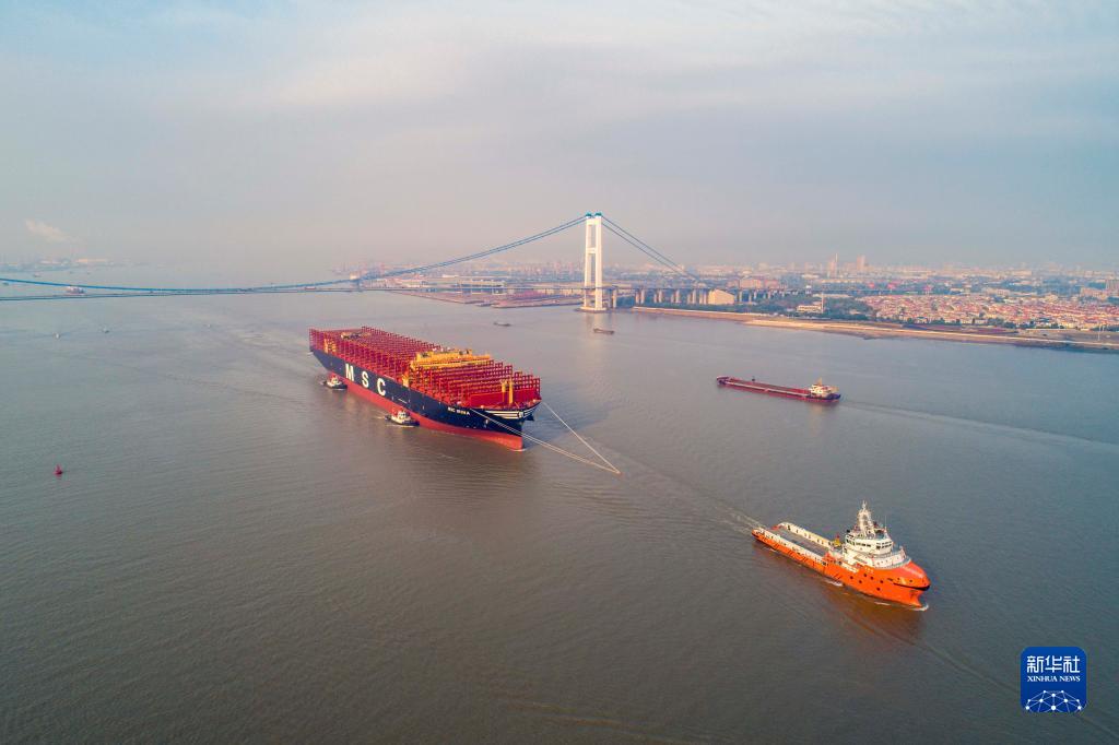 在海事部門(mén)海巡艇護航下,一次可裝載24346個(gè)標準集裝箱的集裝箱船“鑫福102”輪在江蘇泰興揚子鑫福船廠(chǎng)離泊進(jìn)入長(cháng)江拖航作業(yè)(2022年12月12日攝,無(wú)人機照片)。新華社發(fā)(湯德宏 攝)