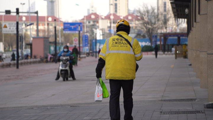圖為一位外賣(mài)騎手正在送餐。(方金洋攝)