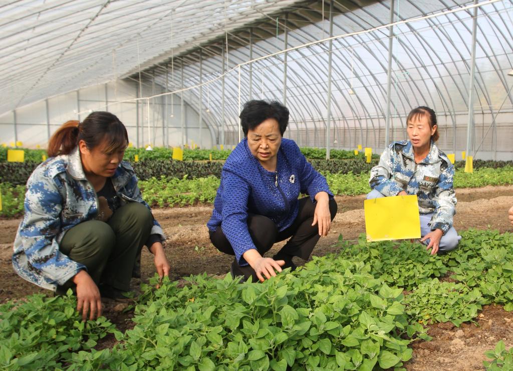 王銀香與種植戶(hù)交流農作物長(cháng)勢。(受訪(fǎng)者供圖)