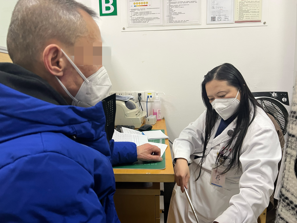 陳嬿(右一)在為患者做檢查。新華社記者 袁全 攝