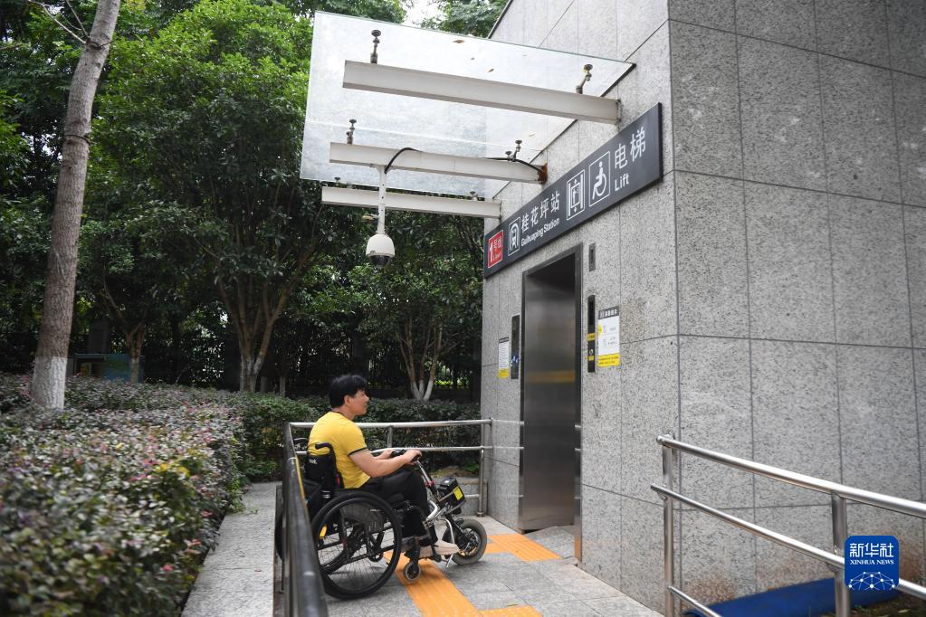 伍樹(shù)林在湖南省長(cháng)沙市桂花坪地鐵站外等候無(wú)障礙電梯進(jìn)站(2021年8月25日攝)。新華社記者 薛宇舸 攝