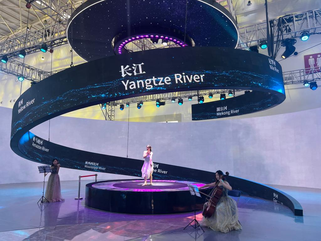放眼全球,世界名曲與大江大河的有機融合令人心馳神往。在當天的展會(huì )上,數萬(wàn)名觀(guān)眾踏著(zhù)音樂(lè )的足跡沉浸式逛展。華中師范大學(xué)學(xué)生馬欣宇在觀(guān)賞“世界大河”館內的《黃河頌》表演時(shí)連聲贊嘆?!安煌拇蠛语L(fēng)光在一首首江河之歌間緩緩流淌,仿佛世界文明就在我眼前一一展現。以后一定要去到這些地方,親自看一遍、聽(tīng)一遍?!瘪R欣宇說(shuō)。