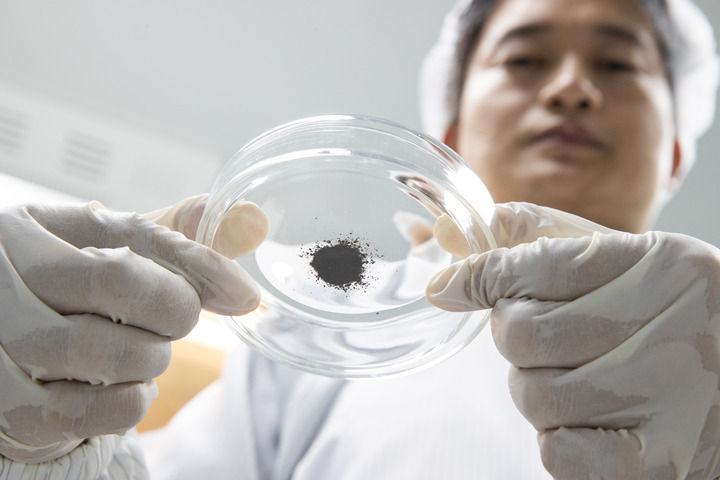 2021年10月15日,在中科院地質(zhì)與地球物理研究所月球樣品潔凈室,田恒次副研究員在處理月球樣品。新華社記者 金立旺 攝