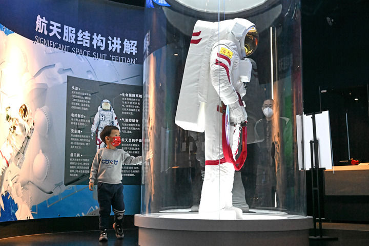 2023年1月7日,一名兒童在國家海洋博物館參觀(guān)“探索·星辰大海──航天科技主題成果巡回展”。新華社記者 趙子碩 攝