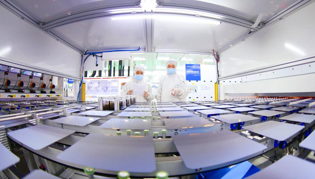 在晶澳太陽(yáng)能科技股份有限公司,工作人員正在記錄智能化生產(chǎn)線(xiàn)運行情況。新華社記者岳文婷 攝