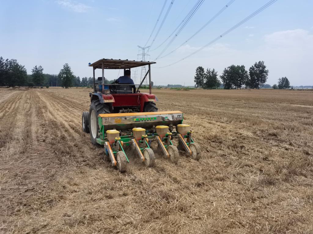 6月2日,在安徽省阜陽(yáng)市阜南縣許堂鄉劉崗村,村民剛收完小麥,就忙著(zhù)種玉米。新華社記者 水金辰 攝