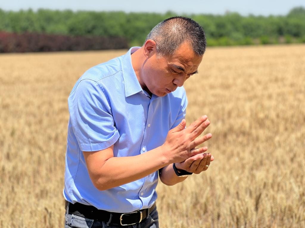 山東省淄博市桓臺縣果里鎮李王村黨支部書(shū)記陳海峰正在麥田里查看麥粒灌漿情況。新華社記者 葉婧 攝