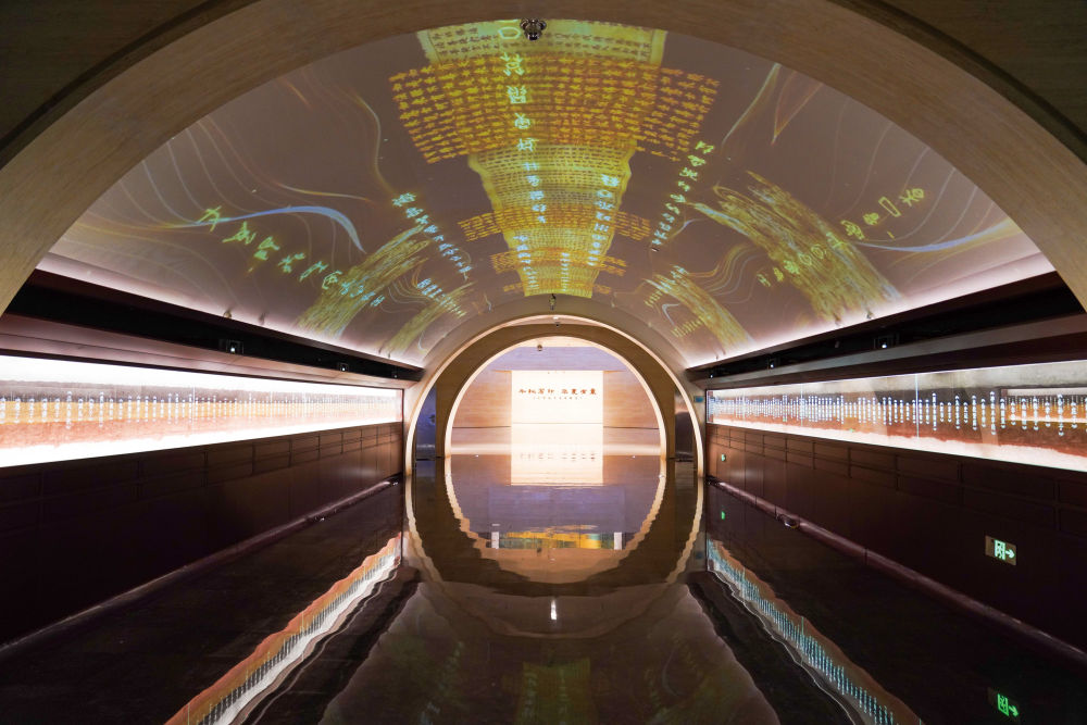 漫步其中,從詮釋藏書(shū)文化的“文瀚八景”到國家書(shū)房?jì)仍从谒未煳氖虉D的星空穹頂,從呈現中國歷代書(shū)法繪畫(huà)經(jīng)典的文化長(cháng)廊到洞庫拱頂獨具東方美學(xué)韻味的飛天壁畫(huà),富含中國文化元素的設計隨處可見(jiàn)。