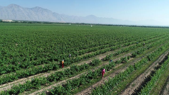 6月7日,在位于賀蘭山東麓的西鴿酒莊,一名工人在釀酒葡萄種植基地勞作。新華社記者 馮開(kāi)華 攝