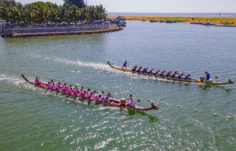 6月22日,海南省瓊海市博鰲水域龍舟賽在緊張進(jìn)行(無(wú)人機照片) 。新華社發(fā)(蒙鐘德攝)