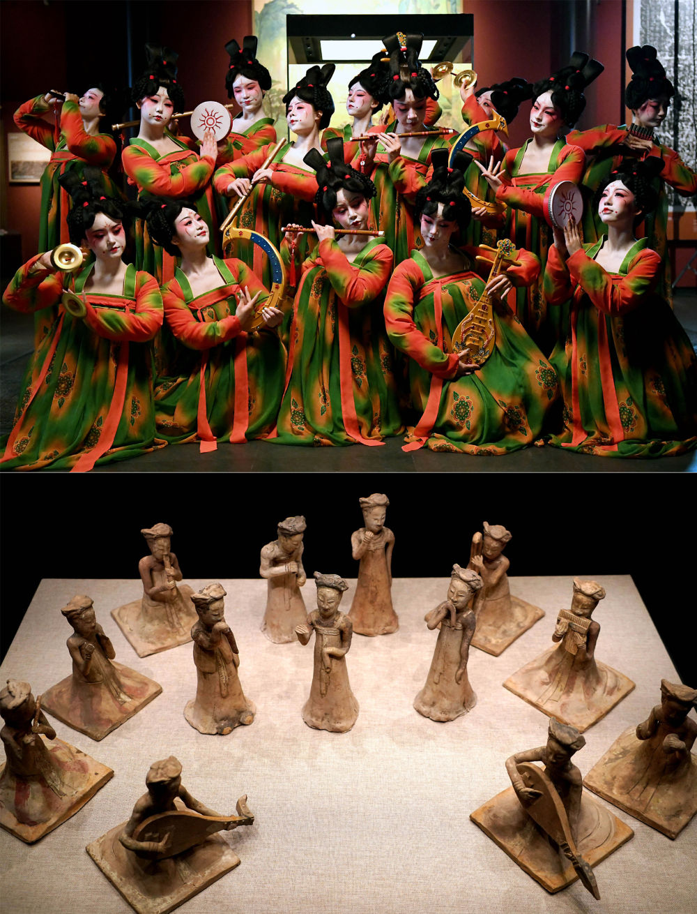 這是一張拼版照片:上圖為鄭州歌舞劇院的演員在錄制河南博物院元宵奇妙夜節目(2021年2月20日攝);下圖為河南博物院主展館內展出的展品(2020年9月24日攝)。新華社記者 李安 攝