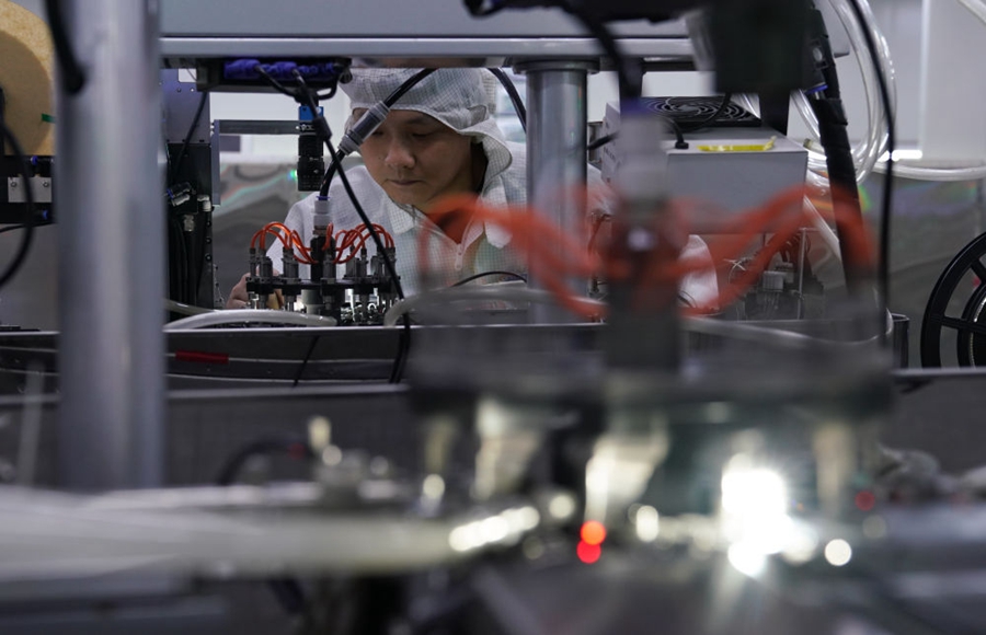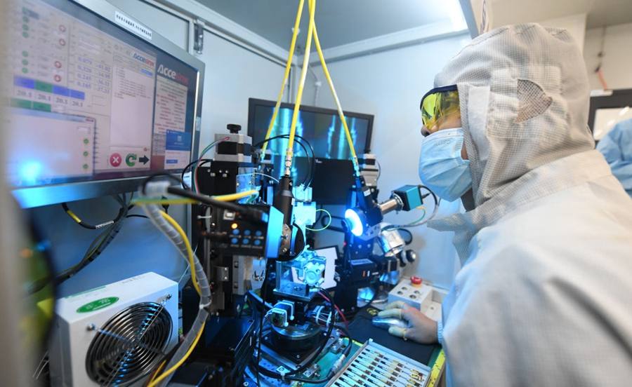 武漢光谷,技術(shù)人員在光模塊生產(chǎn)線(xiàn)作業(yè) 程敏/攝