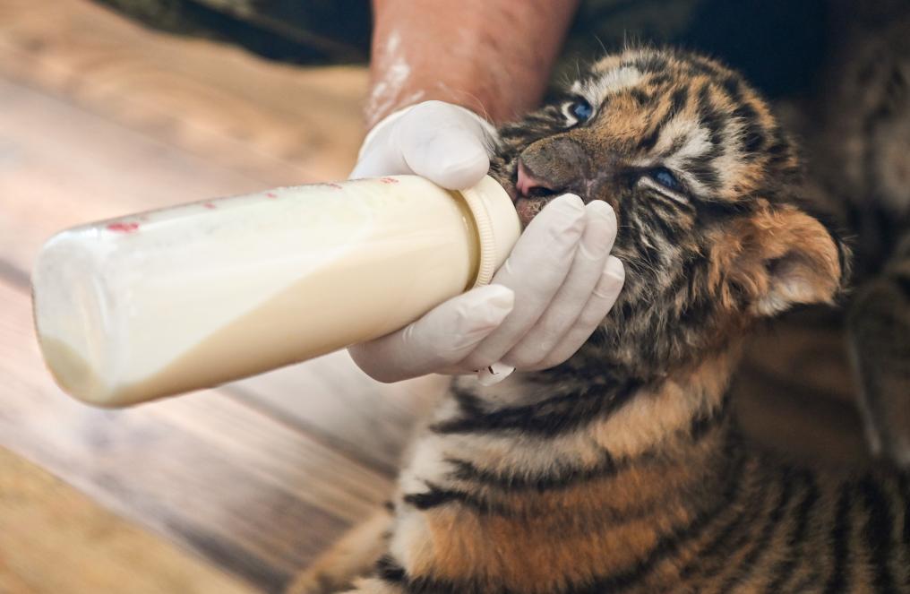 2023年6月13日,在黑龍江東北虎林園的虎舍中,飼養員給東北虎幼崽喂奶。新華社記者謝劍飛 攝