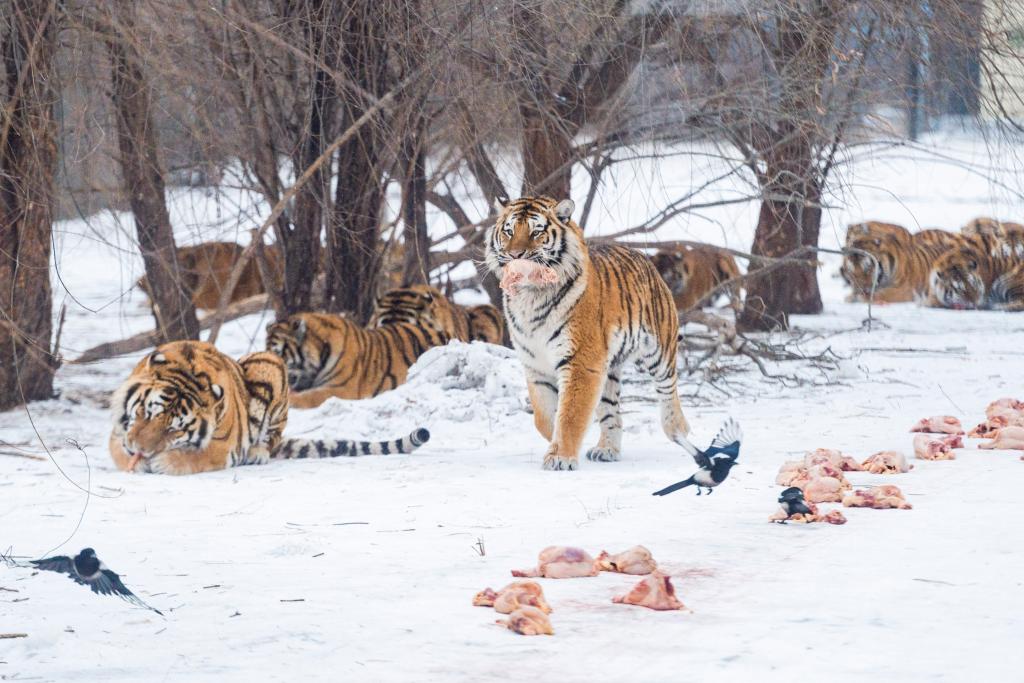 “為了不讓老虎飯來(lái)張口,我們想了很多辦法,滑輪送飯是其中一種。老虎在野外的時(shí)候,并不是每天都能吃上飯,為了保持它們對食物的欲望和野性,我們每周還給老虎‘辟谷’,讓它們斷食一天?!憋曫B員徐彪說(shuō),“你看,這兩只剛剛‘辟谷’后的老虎,吃飯是不是特別香?”