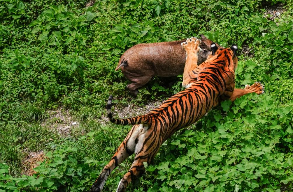 福建梅花山“中國虎園”中正在捕獵的華南虎。(劉艷暉 攝)