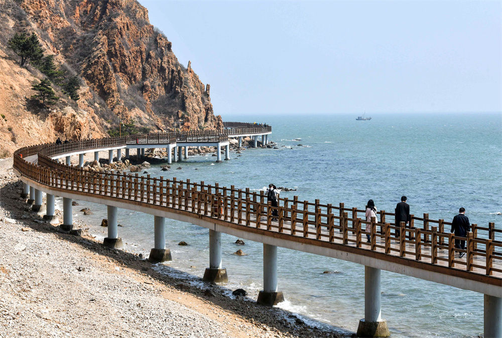 游人在煙臺長(cháng)島海濱步行棧道上參觀(guān)游覽(2019年4月19日攝)。新華社記者 朱崢 攝