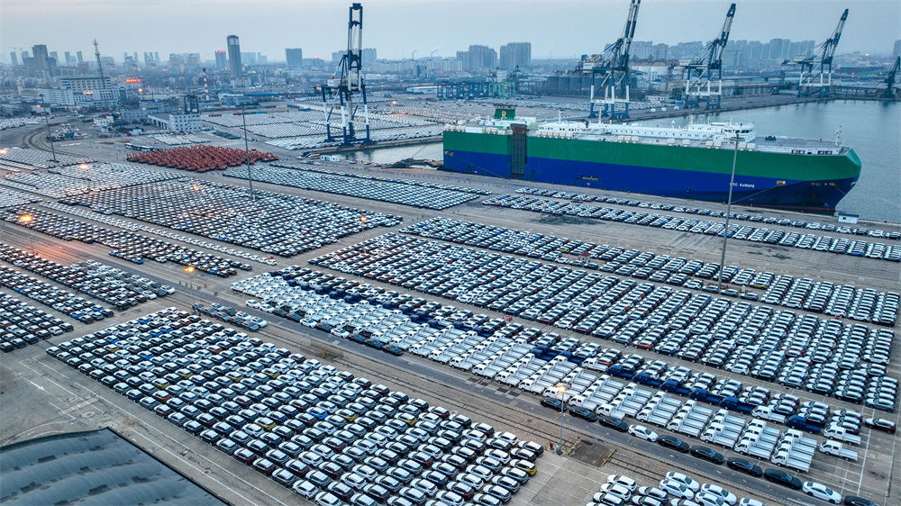 在煙臺港商品車(chē)滾裝碼頭,外貿商品車(chē)在等候發(fā)運(2023年1月18日攝,無(wú)人機照片)。新華社記者 朱崢 攝