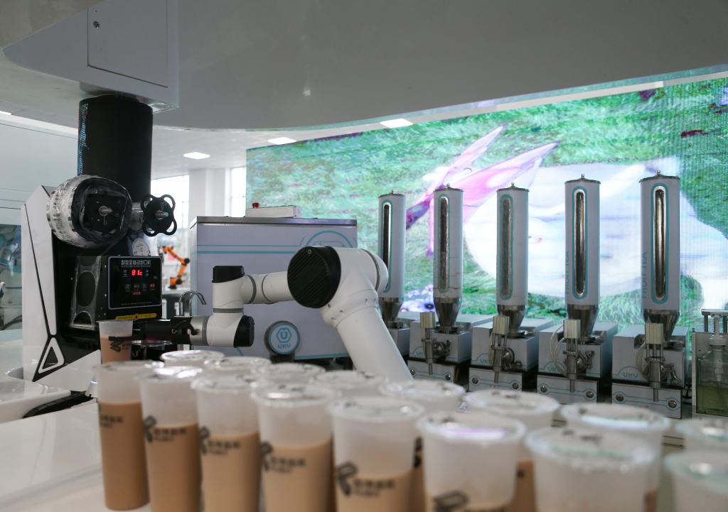 淄博市臨淄區的遨博(山東)智能機器人有限公司,機器人在制作奶茶。新華社記者張浩波 攝