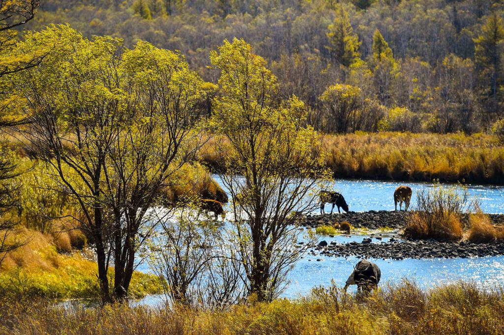 牛群在阿爾山國家森林公園內的河岸邊覓食(2022年9月21日攝)。新華社記者 彭源 攝