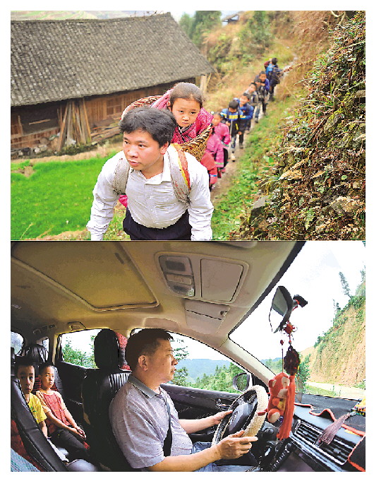 ▲上圖:在廣西龍勝龍脊鎮江柳村,江柳村翁江小學(xué)唯一的老師在放學(xué)路上將一個(gè)走不動(dòng)了的孩子背在背簍里,領(lǐng)著(zhù)其他孩子一起回家(2013年2月26日攝);下圖:余啟貴開(kāi)著(zhù)自己的汽車(chē)帶著(zhù)學(xué)生去學(xué)校(2020年7月7日攝)。新華社記者陸波岸攝