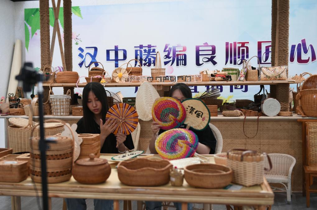 9月7日,在位于漢中市的陜西良順匠心實(shí)業(yè)有限公司,工作人員在直播推薦藤編工藝品。新華社記者 張曼怡 攝