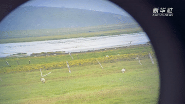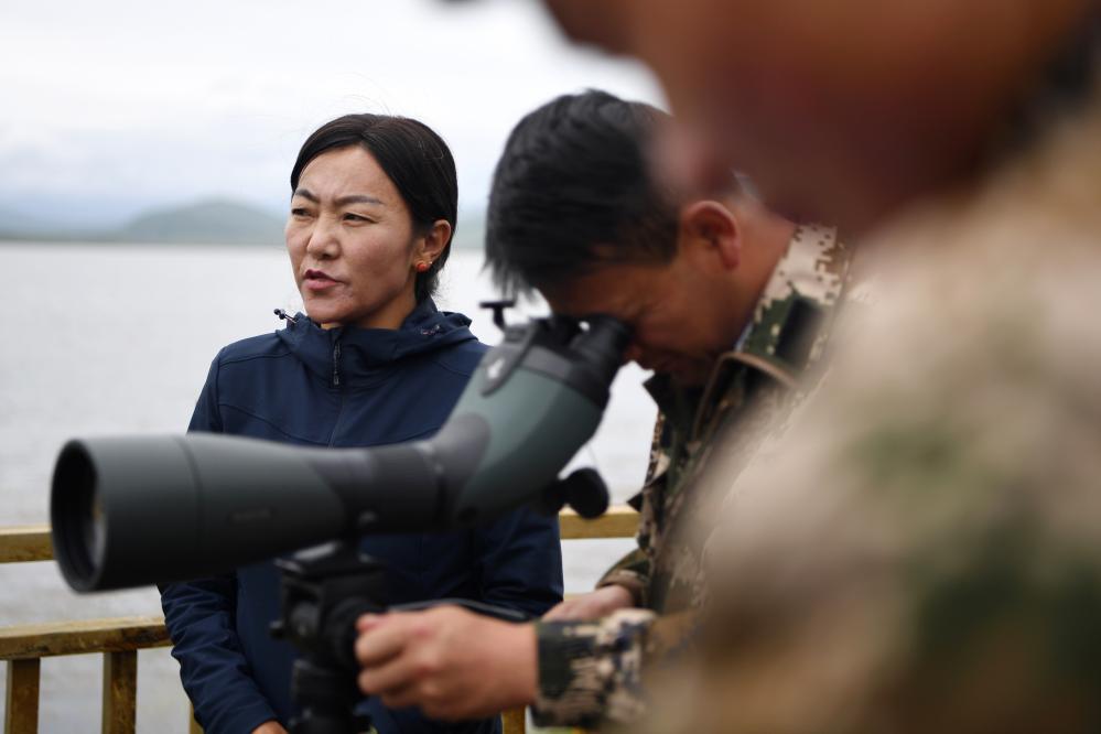 甘肅尕海則岔國家級自然保護區管護中心尕海保護站站長(cháng)香毛吉(左一)和同事在保護區內用望遠鏡觀(guān)測野生動(dòng)物。 新華社記者 陳斌 攝