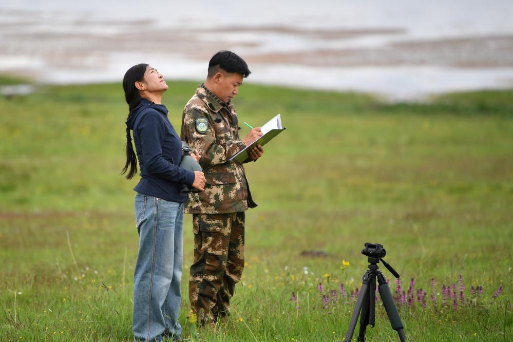 甘肅尕海則岔國家級自然保護區管護中心尕海保護站站長(cháng)香毛吉(左)和同事在巡護過(guò)程中做記錄。 新華社記者 方欣 攝