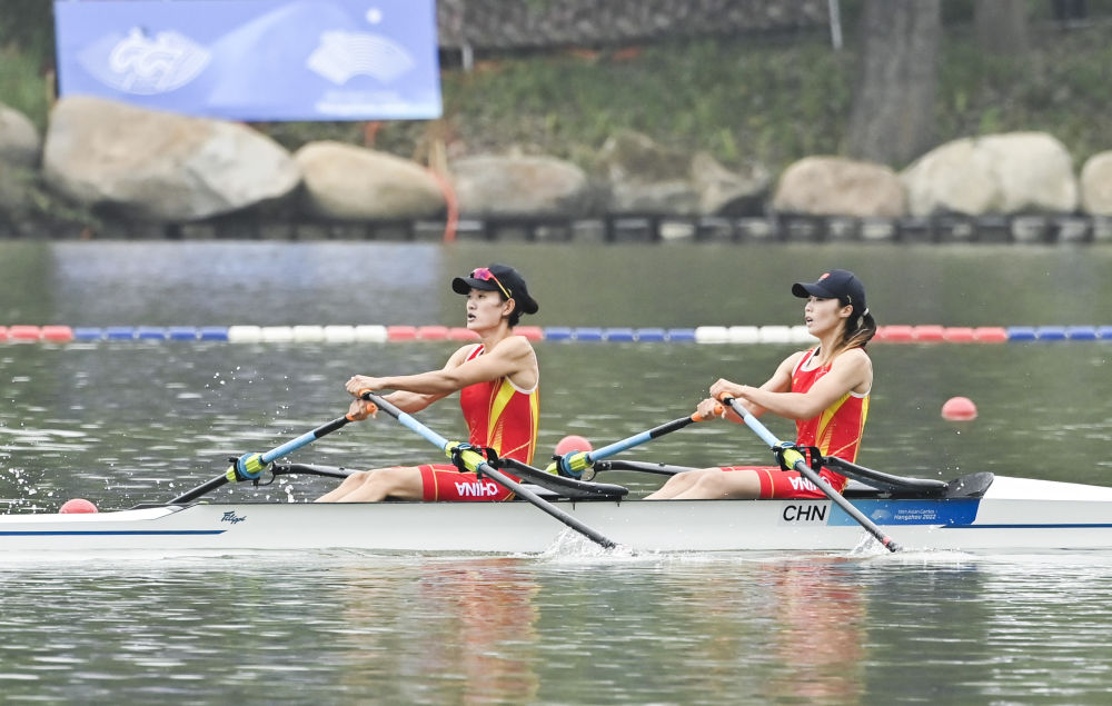 9月24日,在杭州亞運會(huì )賽艇女子輕量級雙人雙槳決賽中,中國組合鄒佳琪/邱秀萍以7分06秒78的成績(jì)奪得冠軍,斬獲本屆亞運會(huì )首金。這是鄒佳琪(右)/邱秀萍在決賽中。新華社記者 江漢 攝