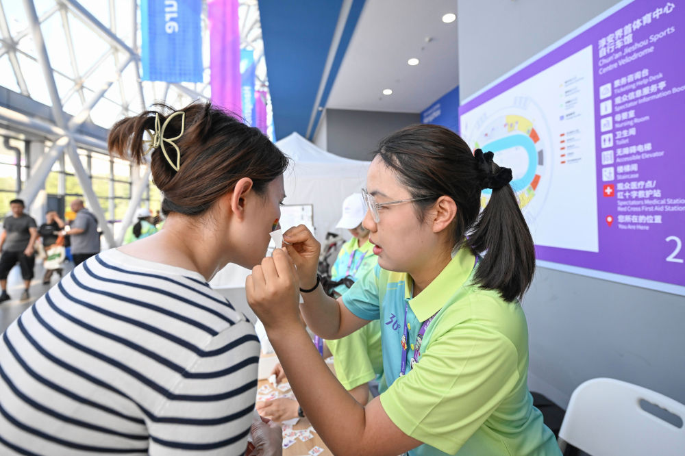 9月26日,浙江杭州淳安界首體育中心自行車(chē)館場(chǎng)館志愿者為前來(lái)觀(guān)賽的觀(guān)眾貼上加油助威貼紙。新華社記者 胡虎虎 攝