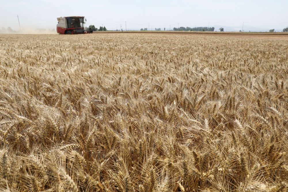 河南省焦作市溫縣黃河街道張王莊村村民駕駛收割機在田間收獲小麥(2023年6月6日攝)。新華社發(fā)(徐宏星 攝)