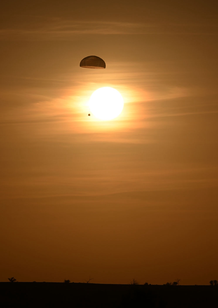 清晨,天已大亮?!班亍钡匾宦?,天空中傳來(lái)返回艙開(kāi)傘的聲音。
