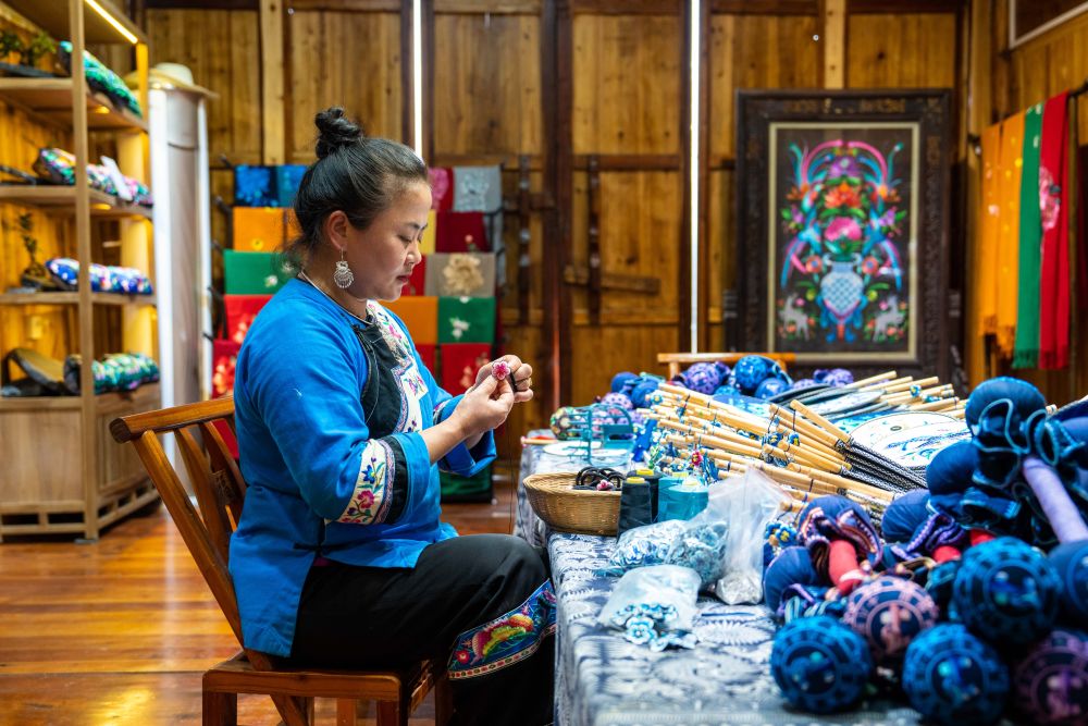 在湘西十八洞村,村民在十八洞苗繡鄉村振興示范基地制作苗繡工藝品(2023年10月11日攝)。新華社記者陳思汗攝
