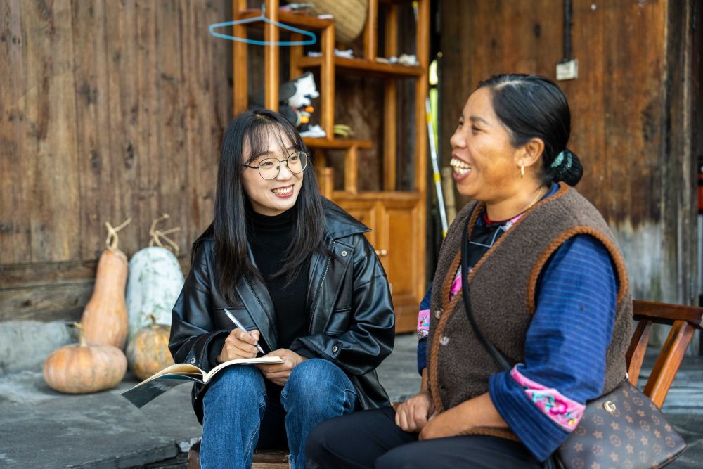 在湘西十八洞村,駐村干部杜霽(左)在走訪(fǎng)村民(2023年11月1日攝)。新華社記者陳思汗攝