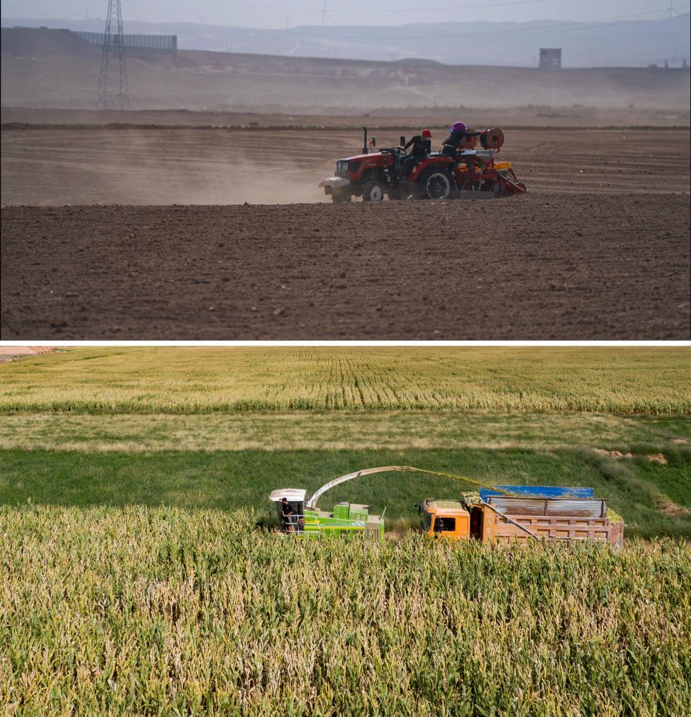 這是一張拼版照片:上圖是農民在寧夏吳忠市同心縣韋州鎮鋪設滴灌帶(資料圖片);下圖是寧夏吳忠市同心縣韋州鎮現代高效節水灌溉項目建成后的高標準農田,收割機在收割玉米(2023年9月14日攝)。新華社記者 楊植森 攝